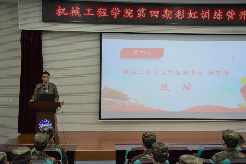 10月24日上午,机械工程学院第四期彩虹训练营开营仪式在机械馆J3举行。仪式由辅导员王昕琦主持,学院党委副书记杨东峰、辅导员郭刚军、张子莹出席仪式。