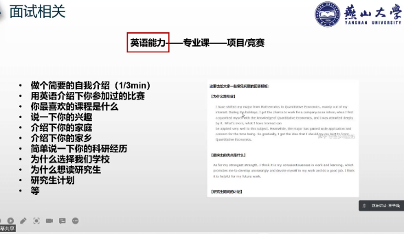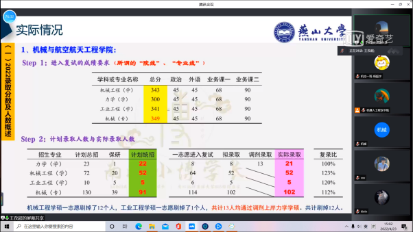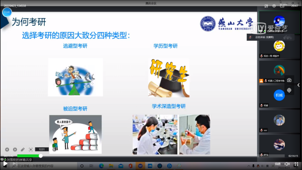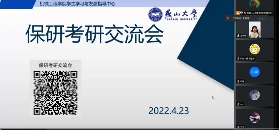 2022年4月23日,机械工程学院学生学习与发展指导中心圆满举办考研保研交流会。本次交流会通过腾讯会议直播的形式开展,分为上午和下午两场,上午为保研经验分享,其目的是帮助同学们明确保研规则,熟悉保研流程,掌握保研方法,并提前做好准备工作。此次会议邀请了王子炀、巩硕、朱豪杰、耿浩壮四位学长为同学们分享保研经验,解答保研过程中常见的问题。
