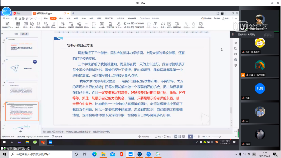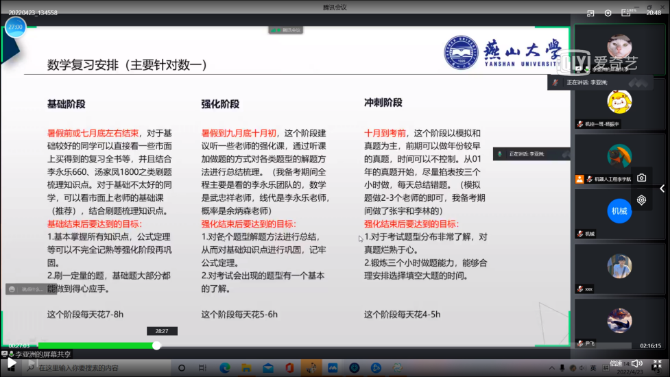 第二位主讲人来自18级机械设计3班的李亚洲,成功上岸于西安交通大学。在本次交流会中,他分步骤、分阶段、分学科进行了详细的讲解。同时,也介绍了多方式的学习渠道与专业课的复习方法。