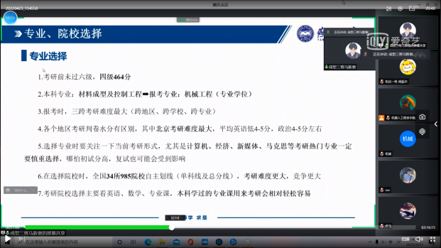 第三位主讲人来自18级材料成型及控制工程3班的马新奥学长,成功上岸于大连理工大学。在交流会中,他主要介绍了专业及院校的选择以及各个科目的复习情况和在考研过程中常见的一些问题。
