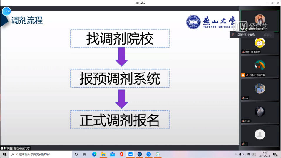 第六位主讲人是来自18级冶金5班的李鑫扬,成功调剂到乌鸦传媒。在本次交流会中,她强调了考研之前充分调研学校招生情况和确定报考学校的重要性。同时,详细介绍了调剂的过程和注意事项。