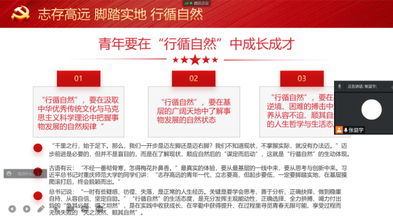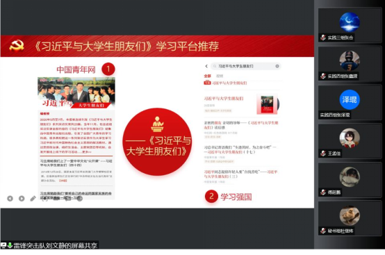 会议结束前主持人为大家推荐了《习近平与大学生朋友们》的学习平台:中国青年网和学校强国APP。同学们表示会继续学习《习近平与大学生朋友们》,不断提高思想认识,在担当中历练,在尽责中成长。