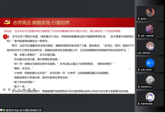 雷锋突击队秘书长刘文静首先为大家介绍《习近平与大学生朋友们》这本书的创作背景以及现实意义。随后其就本书第二十五篇——《习近平总书记寄语我们“志存高远、脚踏实地、行循自然”》与大家分享此篇记载的习近平总书记在内蒙古大学与大学生交流的故事。通过当时的采访对话感受习近平总书记对青年成长与发展的关注和重视,对青年所思所想的了解和思考。