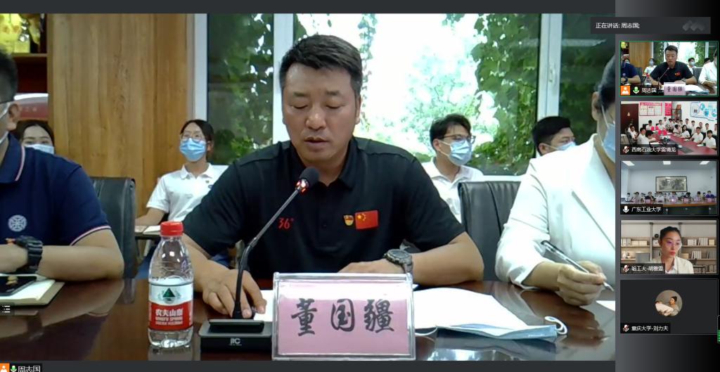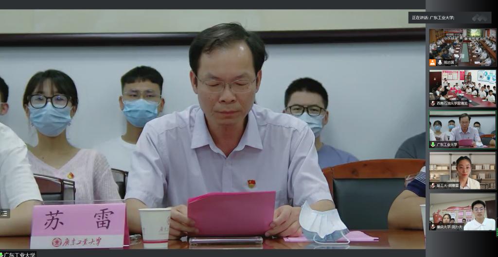 董国疆首先对参加本次云共建的高校和师生表示欢迎和感谢,并介绍了机械工程学院的发展历程和特色,对学院的党建成绩和以“云共建”为代表的特色工作做了回顾,对新一期云共建活动提出了殷切期望和建议,希望借党支部“云共建”活动搭建支部、学院、学校间交流与合作的纽带和桥梁;苏雷也在会上发表讲话,他对活动给予高度认可,并简要介绍了广东工业大学自动化学院的发展历史和概况,对学院党建工作取得的成绩和特色工作做了较详细介绍。