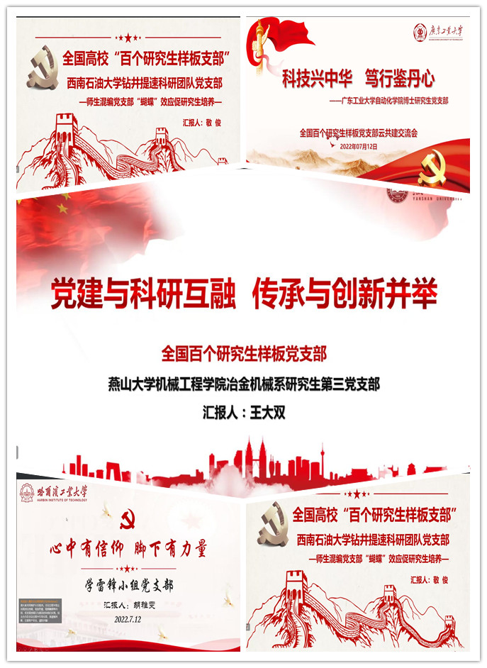 哈尔滨工业大学机电工程学院学雷锋小组党支部、西南石油大学机电工程学院钻井提速科研团队党支部、重庆大学机械工程学院研究生十二支部、广东工业大学自动化学院博士研究生党支部、乌鸦传媒机械工程学院冶金机械系研究生第三党支部等5个第二批全国百个研究生样板支部建设序列单位分别介绍了支部活动开展情况、特色项目及特有优势。精彩的发言和各具特色的支部建设工作使参会师生获益匪浅。