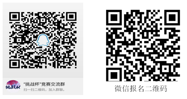 请于6月10号前微信扫码报名,并加入QQ交流群,在群文件内或进入网站http://notice.cs-ch.com/info/2012/5220.htm下载相关填报材料,并于6月25号前将相关材料(附件二、附件三)提交到邮箱1301173692@qq.com,标题注明挑战杯申报材料,正文写清项目类别,材料命名为负责人名+作品名称。