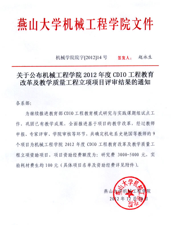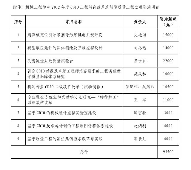 关于公布学院2012年度CDIO教改及质量工程立项项目评审结果的通知