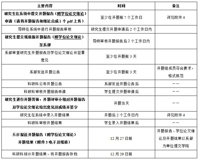 各系、部统一安排研究生开题工作,原则上应于2020年12月27日前完成。每名硕士生开题汇报时间一般不少于15min,博士生一般不少于20min。