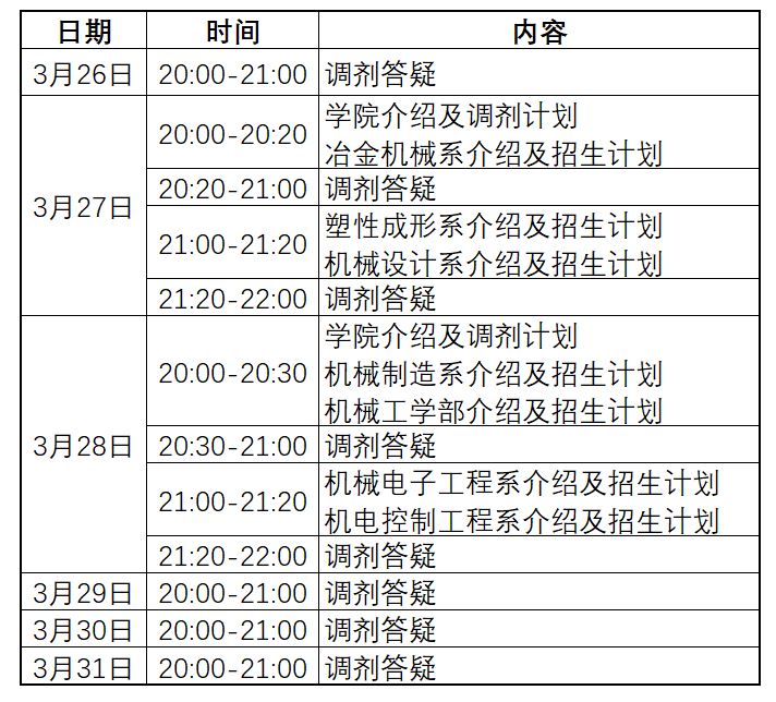 为方便各位考生了解学院硕士研究生调剂招生情况,学院拟于2022年3月26日-31日开展网络视频直播答疑活动,具体安排如下: