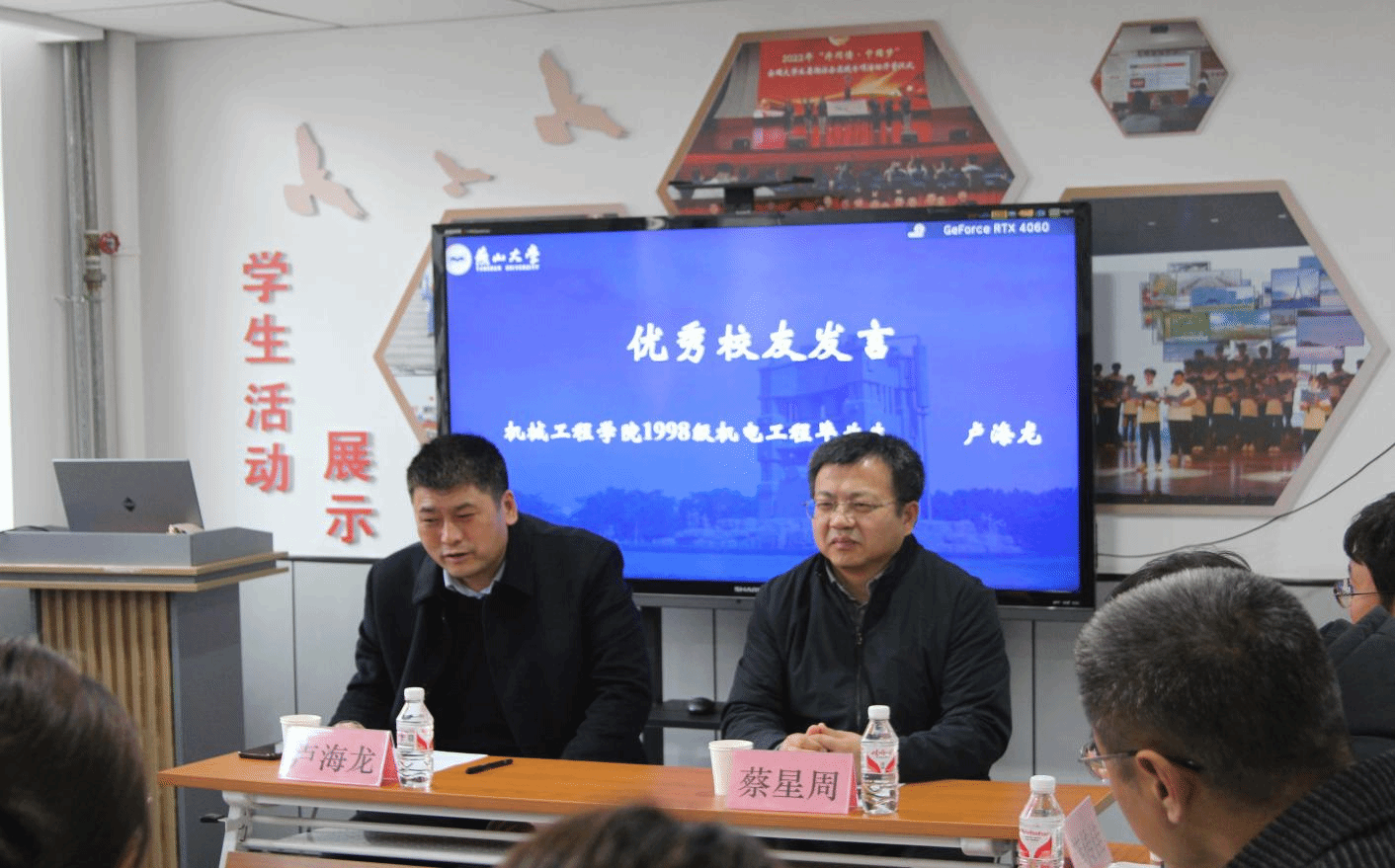 接下来,校友和学生代表分享环节。卢海龙深情回顾了学生时代的校园往事,并感恩母校培养与支持。他从初入职场的快速成长、辞职创办企业的艰辛历程等方面讲述了个人发展经历,以自身在成长过程中的经验教训为背景进行“现身说法”,向在场同学传授了宝贵的“成长秘籍”。他表示,对于即将奔赴社会、步入职场的同学们来说,除了要具备过硬的专业本领外,还应该不断提升综合素质,要积极学习社交礼仪、熟悉职场规则,更要加快转变思维,主动适应职场环境。他希望各位同学能够充分结合现有资源条件、个人性格特征、自身兴趣爱好等因素及早确定人生目标,并嘱咐同学们珍惜当下校园时光,高效利用学校资源,学好专业知识,为今后步入社会、追求个人理想做好蓄力、打好基础。然后,2021级冶金专业许华航、2024级赵鑫磊、付钰珊、孟鹏博4位学生代表也就自身校园生活经历及职业发展目标依次进行了发言。