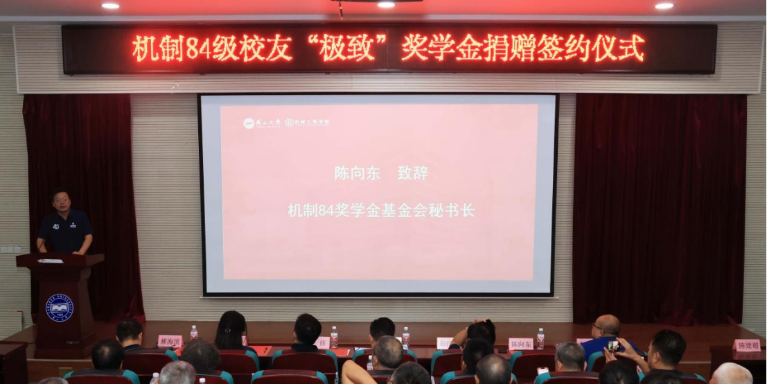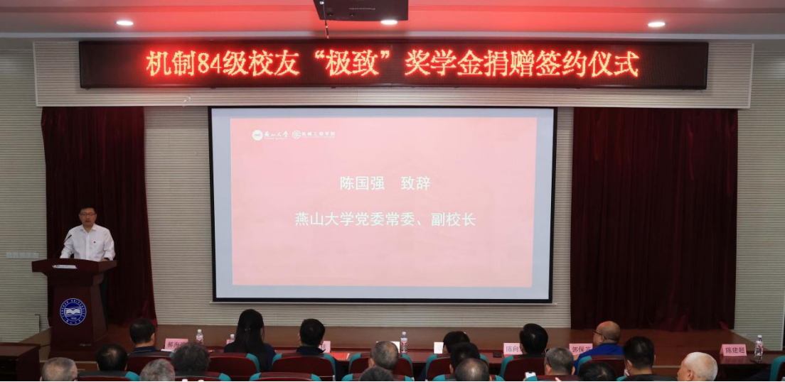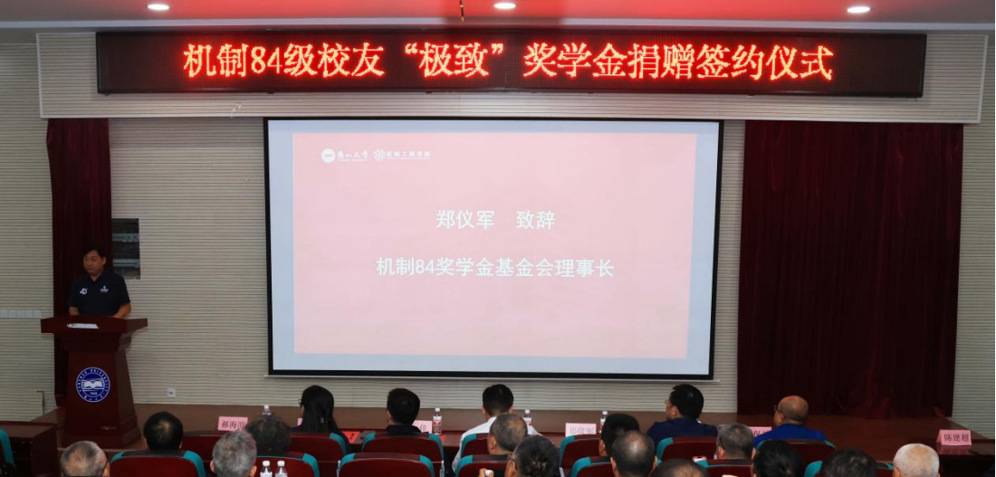 郑仪军首先代表校友致辞,他说得益于母校的培养,84级机制专业的毕业生在各行各业都取得了一定成绩,也为国家和社会发展贡献了燕大力量。回顾聚首40年,母校的一砖一瓦,老师的言传身教,同窗的音容笑貌都成为自己人生路中最温暖的回忆。为了更好的回馈母校,全体84级机制专业校友发起并成立了“极致”奖学金,首期捐赠45万元,奖助机械工程学院大四年级本科生,以求帮助母校培养更多、更好的专业技术人才。