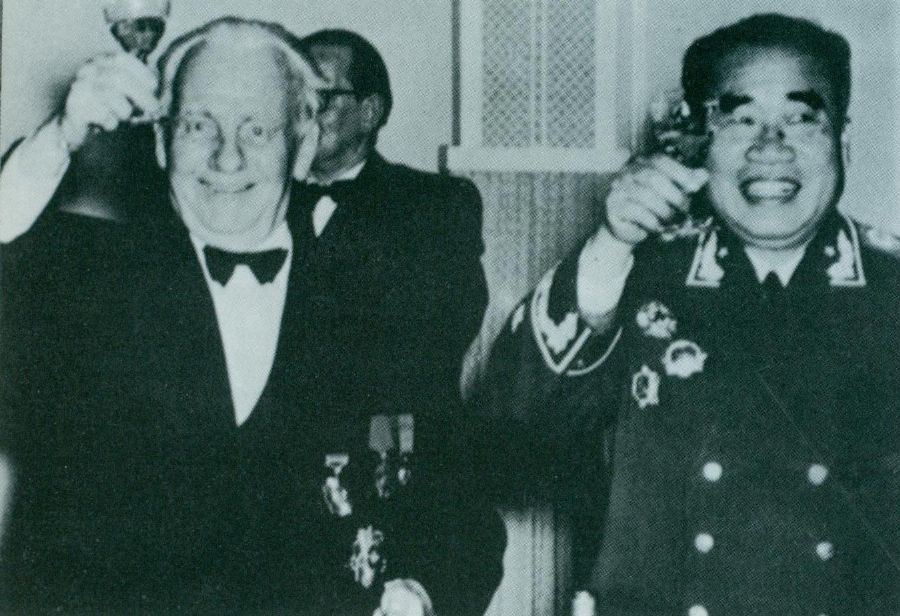 1956年1月4日,朱德率代表团出席了在柏林政府大厦举行的庆祝德意志民主共和国总统威廉·皮克80寿辰招待会。这是朱德向皮克总统祝酒。