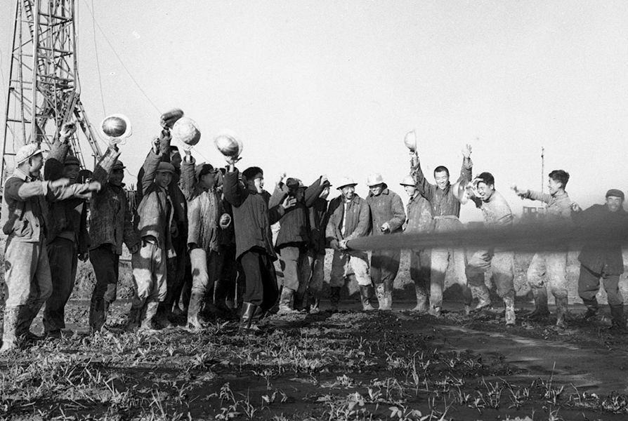 1963年,大庆油田建成。这是大庆油田工人在对一口油井进行试喷。新华社图片