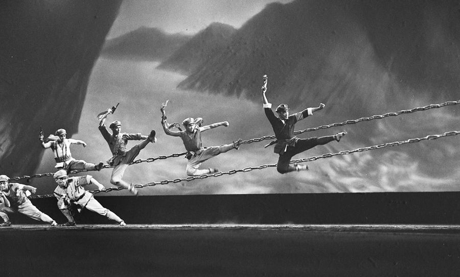 1964年10月,大型音乐舞蹈史诗《东方红》在北京人民大会堂首演。这是以红军长征为主题的《东方红》第三场《万水千山》。新华社图片