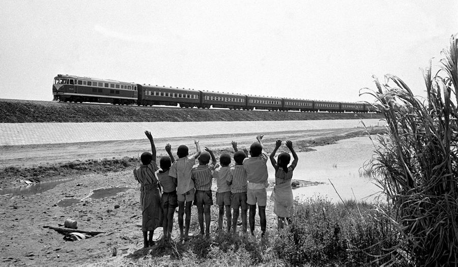 图为赞比亚鲁西瓦西湖畔的少年儿童欢迎坦赞铁路的列车通到他们的家乡。新华社图片