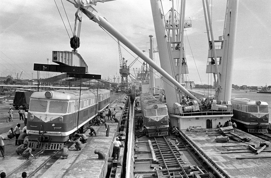 图为中国援助坦赞铁路的首批机车运抵坦桑尼亚达累斯萨拉姆港口。新华社图片